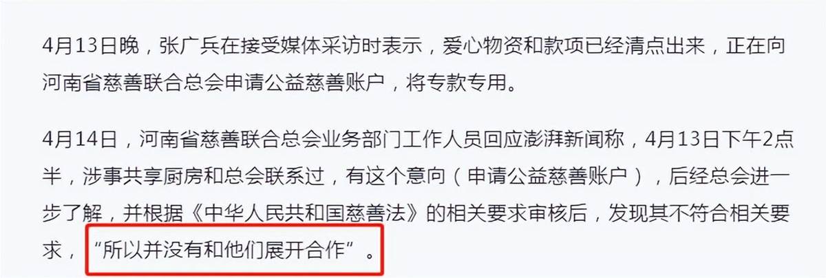 共享廚房質疑聲越來越大,創始人張廣兵表示愛心物資和款項已經清點出來,正在向河南省慈善總會申請公益慈善賬戶,將專款專用。對此,河南省慈善聯合總會稱當事人聯系過,進一步了解后,總會發現其不符合相關要求,所以并沒有和他們展開合作。
